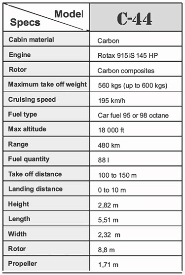 The benefits of the C-44 gyroplane are numerous. The C-44 engine (Rotax 916 iS 160 hp) uses normal car fuel found in domestic fuel stations. It can fly in turbulance, high winds and extremities of cold and hot temperatures. It is easy to pilot, maintain and operate.