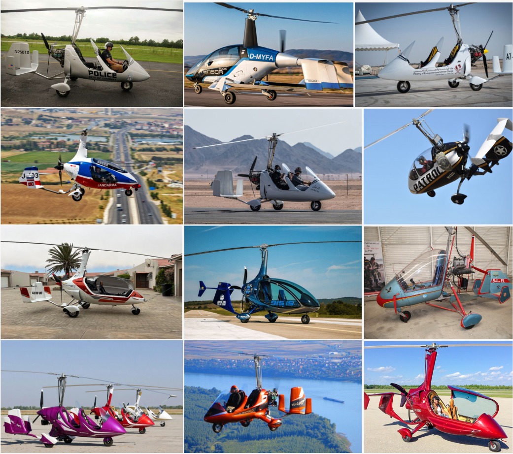 Gyrocopters are certified aircrafts. Looks like a small helicopter; main difference – no engine turning main rotor. Unlike helicopter, rotor not powered directly by engine but self-propels by action of relative airflow on blades